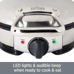 Create each waffle with that perfectly golden crisp on the outside and a gooey, creamy perfection on the inside with All-Clad’s Waffle Maker! This round waffle maker is crafted with 18/10 stainless steel and heavy-gauge aluminum cooking plates to provide a premium non-stick construction. The handy ready light alerts you when warm-up is complete and batter is ready to be added. All-Clad’s Waffle Maker is ideal for creating a classic breakfast with minimal use of greasy sprays and oils!
