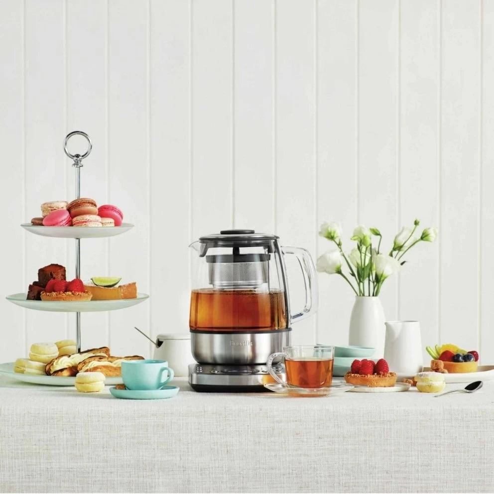 Nothing makes tea easier to brew than the One-Touch Tea Machine from Breville. This kettle features an automated brewing basket that slowly rises and sinks into the water to agitate leaves and ensure you get the fullest flavor. With a German-made carafe and stainless steel base, this tea maker is built to last for years and includes a 1-year warranty for added confidence. Customize your tea with ease using the adjustable temperature settings and steeping timer and work your day around your cups of tea with ease using the programmable feature to set tea up to start up at a specific time. Brew your next cup of tea with ease using the Breville Tea Makerâ„¢, get yours today!