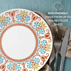 Mimicking the beauty of antique hand-crafted Mexican tile, Corelle’s Terracotta Dreams Collection includes scrolls, florals, and bands in muted tones of brushed teal, yellow, and orange. Part of Corelle’s Global Collection, these dinner plates bring the rich history of Latin America to your table. The Vitrelle® glass is durable, eco-friendly, and effortlessly goes from microwave to table to dishwasher. These plates will bring you joy at mealtime.