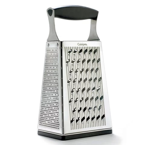 The Cuisipro 4 Sided Grater will meet all your kitchen needs, with fine, coarse, ultra coarse and slicing blades. The snap off bottom catches grated food for storage and easy cleaning.