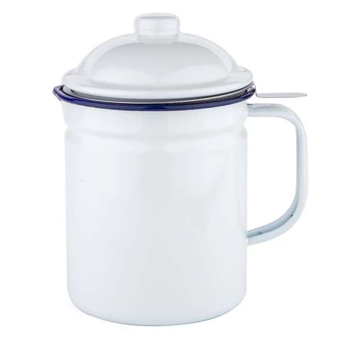Enamel is distinct – especially if it’s Falcon enamelware. Since the 1920s, Falcon has filled British homes and kitchens with its pure white enamel bowls, tumblers and baking dishes, all with their tell-tale royal blue rim. It looks the part, and it’s incredibly tough, as each piece is made by fusing porcelain onto heavy-gauge steel. If you drop it, it won’t break. It’s resistant to chemicals. You can put it in the oven, and you can use it on gas and electric hobs.