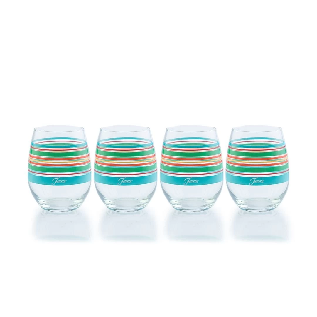 Serve your favorite wine in fun and festive Fiesta® colors with the Stemless Glassware Set in Rainbow Radiance! Crafted of lead-free high-quality glass and proudly made in the USA, these stemless glasses are perfect for serving wine & cocktails at dinner or milk & orange juice with breakfast. With Poppy, Daffodil, Turquoise, Scarlet, & Meadow stripes, these elegant glasses will look great with any of your favorite Fiesta® pieces or as a colorful accent with your existing dinnerware. Add a pop of color to your dinnerware collection with the Fiesta® Stemless Glassware Set today!