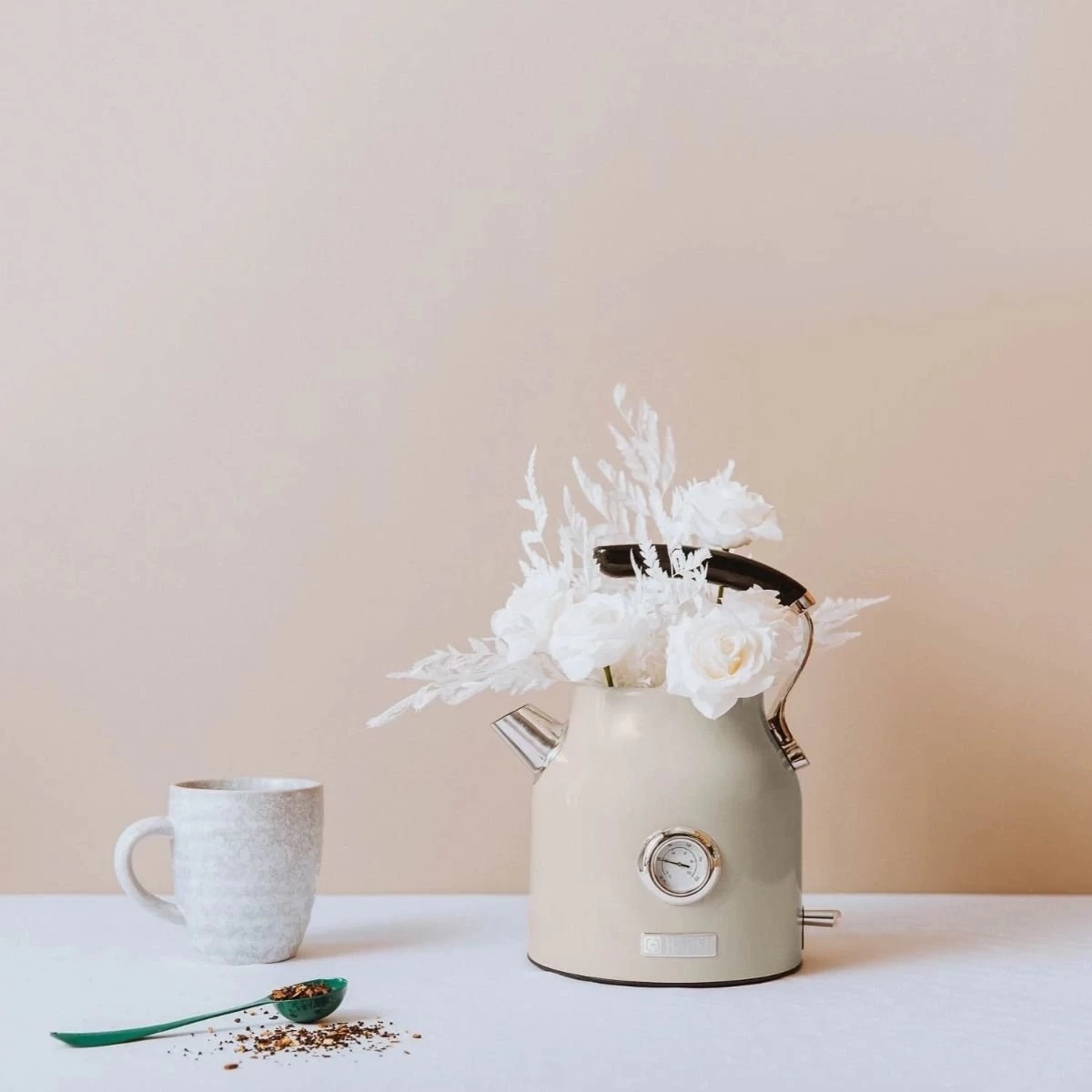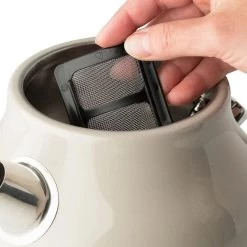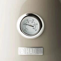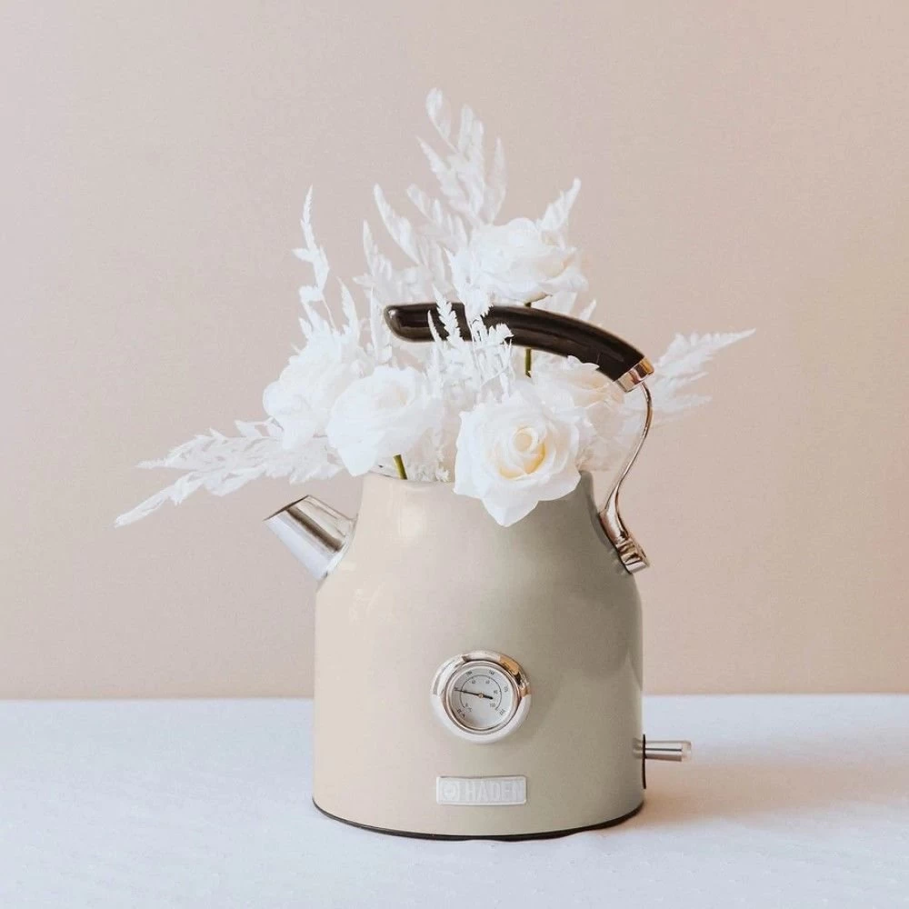 Curl up with a cozy blanket and a warm cup of tea brewed with the help of the Putty Beige Dorset 7-Cup Stainless Steel Electric Kettle by Haden! The creamy putty beige color and timeless design make this electric kettle an attractive addition to any countertop. Featuring a temperature scale and a water gauge window that measures in both cups and liters, you’ll always know exactly what temperature your water is and how much of it is left. This kettle features an automatic shutoff system and boil-dry protection, which will prevent the kettle from turning on when it is empty. The boiling light indicator will let you know when your water is boiling, so you never need to check on your kettle. The stay-cool base allows for easy handling even when the kettle is hot. Add a gorgeous appliance to your kitchen and enjoy the tea or pour-over coffee that you love every day with the Putty Beige Dorset 7-Cup Stainless Steel Electric Kettle by Haden!Â