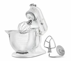 - Includes 5-quart glass bowl, flat beater, wire whip, c-Dough Hook