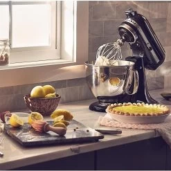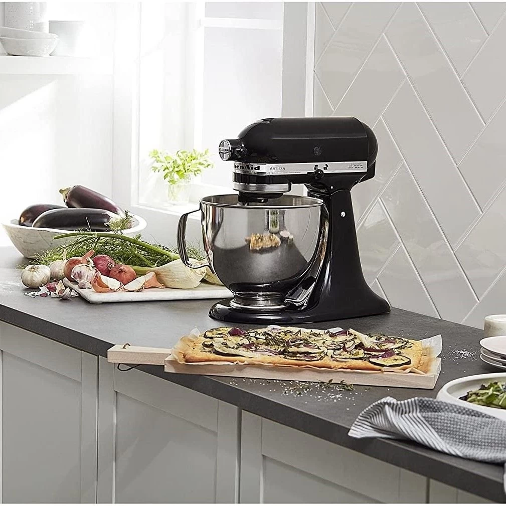 Mix up a batch of brownies, knead homemade pizza dough, or whip up meringue with KitchenAid’s 5-Qt Artisan Stand Mixer! From desserts to appetizers and main dishes, the Artisan will open up a world of tasty possibilities. In smooth, glossy Onyx Black, it will complement any kitchen.