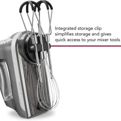 - Integrated storage clip allows you to store beaters and whisk to the underside of the hand mixer